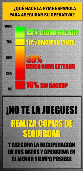 Sorprendentemente, a día de hoy, las encuestas muestran como un 16% de las pequeñas y medianas empresas españolas carece de respaldo ante cualquier incidencia mayor. El 59% de las pymes guarda su información de backup en un único dispositivo extraíble y un 10% basa todas sus copias de seguridad en un sistema de cintas magnéticas con una importante inversión de tiempo y dinero que no siempre funciona al 100%.