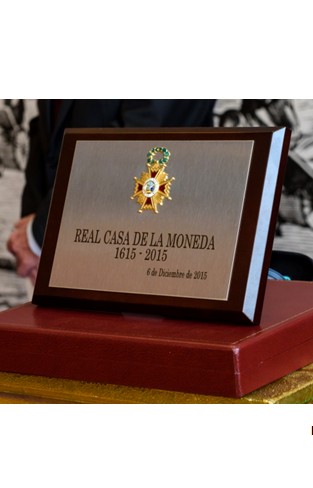 | Placa con la insignia correspondiente a la Encomienda de la Orden, el nombre de la FNMT-RCM y la fecha de la concesión, 6 de diciembre de 2016. |