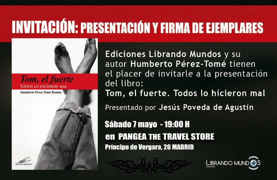 Tom, el fuerte es la primera obra de la trilogía “Todos lo hicieron mal” y está recientemente publicada por Librando Mundos. Será presentada por el doctor Jesús Poveda, médico psiquiatra especializado en juventud y relaciones paterno-filiales. Que el presentador tenga esta especialidad no es algo casual, porque la novela, en palabras de su autor “es la historia entre la controvertida relación de tres miembros de la misma familia –padre, madre e hija- que, a pesar de querer lo mejor para ayudarse, las decisiones tomadas no siempre son las adecuadas”.