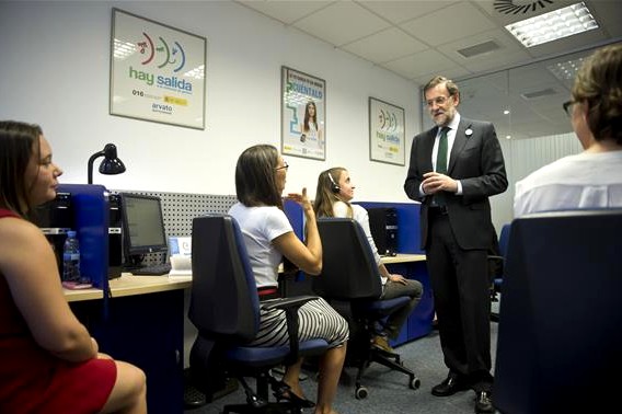 | El Presidente del Gobierno, Mariano Rajoy, durante la visita la sede del servicio 016 contra la violencia de género. |