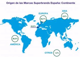 En esta ocasión, el programa Superbrands resalta la presencia de las marcas según su procedencia. En concreto, el mayor porcentaje extraído de la lista es de origen europeo, sumando hasta un 65,5% de la muestra, siendo de éstas más de un 43,7% de origen español. A nivel global en la lista, las marcas españolas que han destacado los consumidores representan un 28,57%.