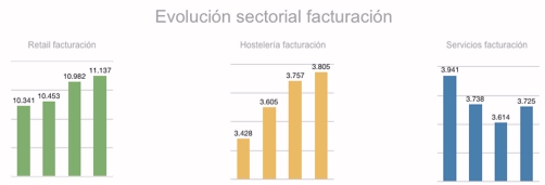 Se pone de manifiesto un importante incremento en el sector Retail que acumula 11.137 millones de euros como resultado del asentamiento de muchas de las marcas presentes en el mercado y también de la aparición de nuevos operadores. Le sigue Restauración con 3.805 millones de euros que mantiene cifras crecientes tras recuperarse del cierre de unidades que actualmente vuelve a recuperar y consolidar y que no dejaran de ir creciendo. Por su parte el sector Servicios con 3.725 millones de euros, no logra recuperar las cifras de antaño y tan solo logra mantenerse.