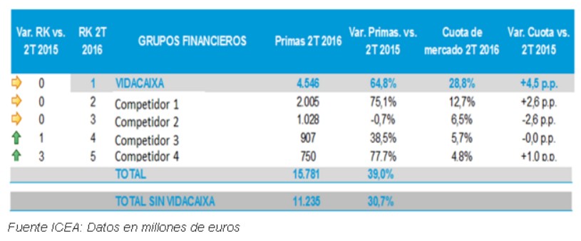 VidaCaixa incrementó en junio la distancia respecto a sus competidores con una cuota de mercado del 28,8%, subiendo 4,5% respecto al año pasado y a más de 16 puntos de la segunda compañía en el ranking. Según datos de ICEA, el crecimiento interanual en primas experimentado por VidaCaixa ascendió al 64,8%, muy por encima del crecimiento medio del mercado que se situó en el 39% a cierre de junio. Sin VidaCaixa, el mercado habría crecido un 8,3% menos.
