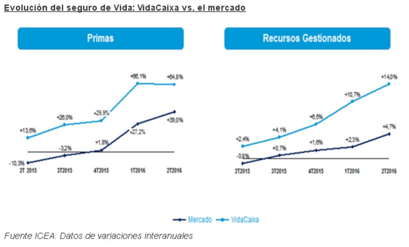 La cuota de mercado avanzó 4,5 puntos hasta el 28,8%, en el total de primas. El volumen de recursos gestionados alcanzó prácticamente los 64.000 millones de euros, un 11,5% más que en 2015. El total de primas y aportaciones (riesgo y ahorro) se incrementó en un 66%, con respecto a junio de 2015 hasta llegar a los 5.810 millones de euros. Más de 4,3 millones de clientes, un 7% más que hace un año, confían en VidaCaixa.