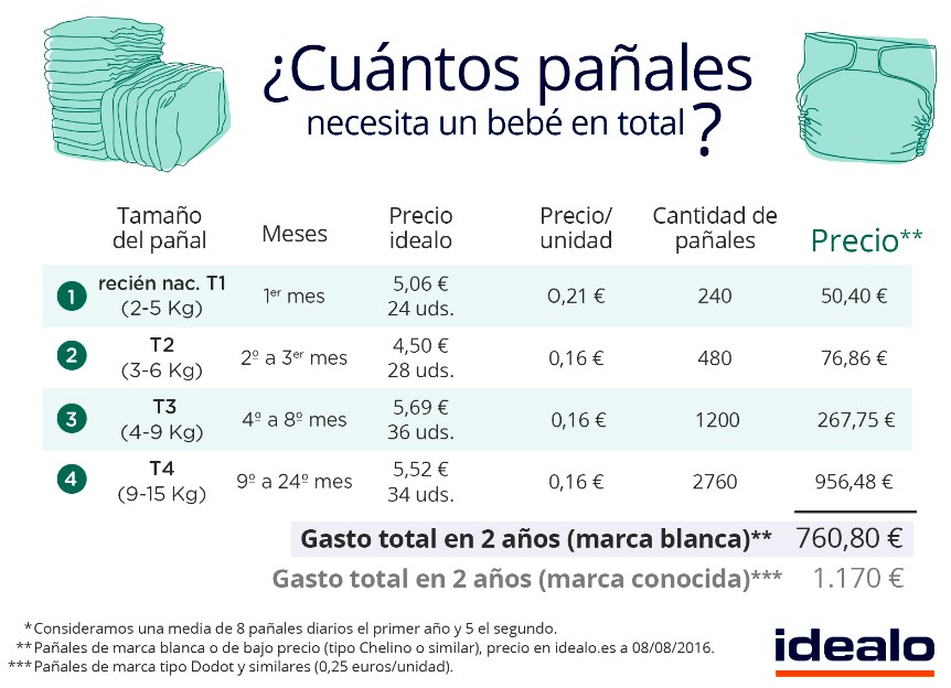 Uno de los factores que más puede hacer variar el coste de adquirir los artículos necesarios para cuidar a nuestro recién nacido es la decisión entre comprar marcas blancas o productos de renombre. Por ejemplo, a la hora de hablar de pañales y teniendo en cuenta que un bebé necesita una media de 8 pañales diarios durante su primer año de vida y 5 durante el segundo, este gasto puede variar durante los primeros 2 años de vida de nuestro hijo entre los 760,80€, si elegimos pañales de menor coste, hasta los 1.170€, eligiendo marcas más caras. Por ello es tan importante comparar precios antes de realizar cualquier compra, de tal forma que podamos ahorrar lo máximo posible.