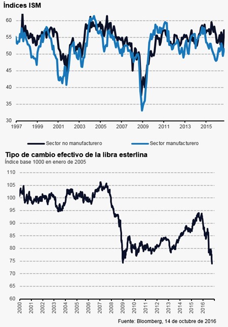 Las últimas encuestas sobre la confianza muestran una buena resistencia de la economía británica a la incertidumbre generada por el referéndum del 23 de junio. Tras una fuerte bajada en julio, el índice PMI compuesto ha repuntado en agosto y ha continuado recuperándose en septiembre, alcanzando su nivel más alto desde enero de 2016, en 53,2, al calor del impulso de un sector manufacturero que parece agradecer la depreciación de la libra.