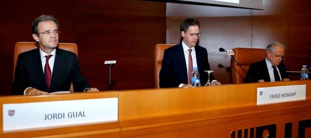 | De izquierda a derecha, Jordi Gual, presidente de CaixaBank, Franz Heukamp, director general del IESE, y Antonio Argandoña, profesor del IESE y titular de la Cátedra. |