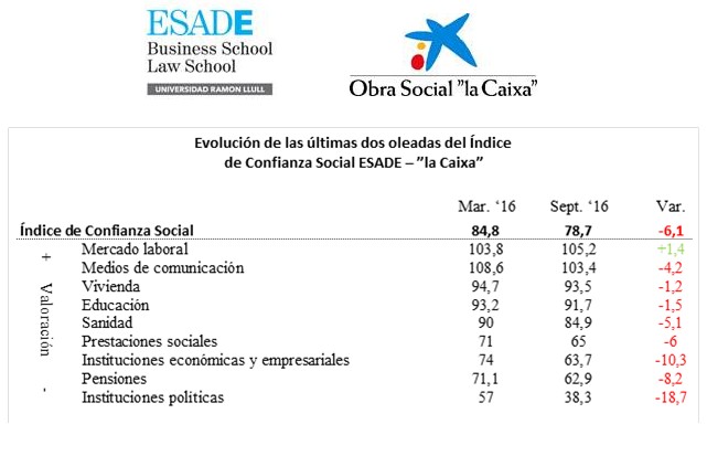 La confianza de los españoles en las instituciones políticas continúa descendiendo en la última oleada del Índice de Confianza Social ESADE –”la Caixa” y se sitúa en 38,3 puntos sobre 200, 19 menos que en el mes de marzo. La sexta edición del Índice muestra asimismo un descenso de la confianza de la sociedad en ocho de los nueve indicadores que lo integran: además de las instituciones políticas, las instituciones económicas y empresariales, la sanidad, la educación, la vivienda, las prestaciones sociales, las pensiones y los medios de comunicación. El Índice de Confianza Social se ha situado en esta oleada, correspondiente a septiembre de 2016, en 78,7 puntos, y retrocede 6,1 puntos respecto a la anterior, realizada en marzo. Esta puntuación es la tercera peor de las seis que acumula el índice desde su lanzamiento en 2014 y confirma el descenso en la confianza social desde septiembre de 2015 tras su aumento ininterrumpido durante el año y medio anterior.