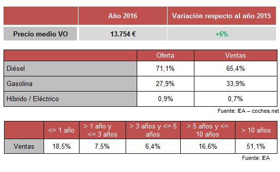 En 2016 se han vendido 1.962.820 vehículos de ocasión, un 13,53% más que el año anterior. De estos, los modelos diésel han representado un 64,9% de las ventas, mientras que los de gasolina han significado el 34,6% del total.