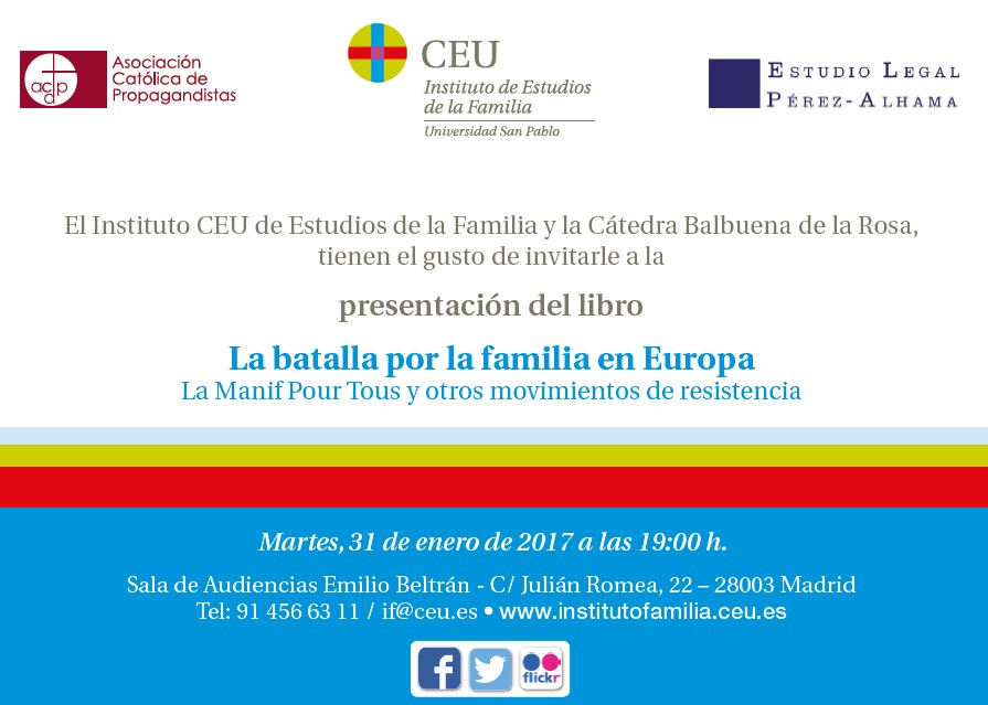 El acto, organizado por el Instituto CEU de Estudios de la Familia y la Cátedra Balbuena de la Rosa, acudirán a la mesa de presentación Juan Pérez Alhama, Director del Estudio Legal Pérez-Alhama; Francisco José Contreras, coordinador de la obra, Titular de la Cátedra Balbuena de la Rosa, Catedrático de Filosofía del Derecho de la Universidad de Sevilla; Luis Peral Guerra Diputado del Partido Popular por Madrid (en sustitución de Jaime Mayor Oreja); Humberto Pérez-Tomé, Director de publicaciones de la editorial Sekotia; Elio Gallego García, Director del Instituto CEU de Estudios de la Familia.
