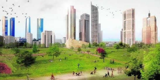 En una de las tres partes en que se quiere dividir la obra, la sur, se pretende construir la nueva Ciudad Financiera. Grandes torres. Destinadas a actividades económicas. Será la Central Business District. Como lo leen. No se le pone nombre en castellano. En inglés. Será por la internacionalización financiera. O para madrugarle a Londres empresas. Estarán las torres cerca de la estación junto a las ya existentes en la antigua Ciudad Deportiva del Real Madrid. Para dar sombra a los barrios.