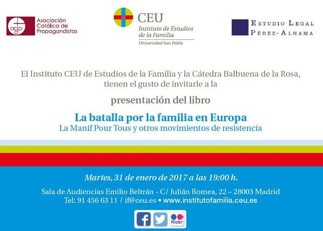 El acto, organizado por el Instituto CEU de Estudios de la Familia y la Cátedra Balbuena de la Rosa, acudirán a la mesa de presentación Juan Pérez Alhama, Director del Estudio Legal Pérez-Alhama; Francisco José Contreras, coordinador de la obra, Titular de la Cátedra Balbuena de la Rosa, Catedrático de Filosofía del Derecho de la Universidad de Sevilla; Luis Peral Guerra Diputado del Partido Popular por Madrid (en sustitución de Jaime Mayor Oreja); Humberto Pérez-Tomé, Director de publicaciones de la editorial Sekotia; Elio Gallego García, Director del Instituto CEU de Estudios de la Familia.