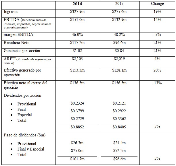 • El dividendo total de $ 101.7 millones, consiste en un dividendo provisional de $ 26.7 millones, un dividendo final de $ 43.6 millones y un dividendo especial de $ 31.4 millones, que representan un pago total del 87% del beneficio neto del año.