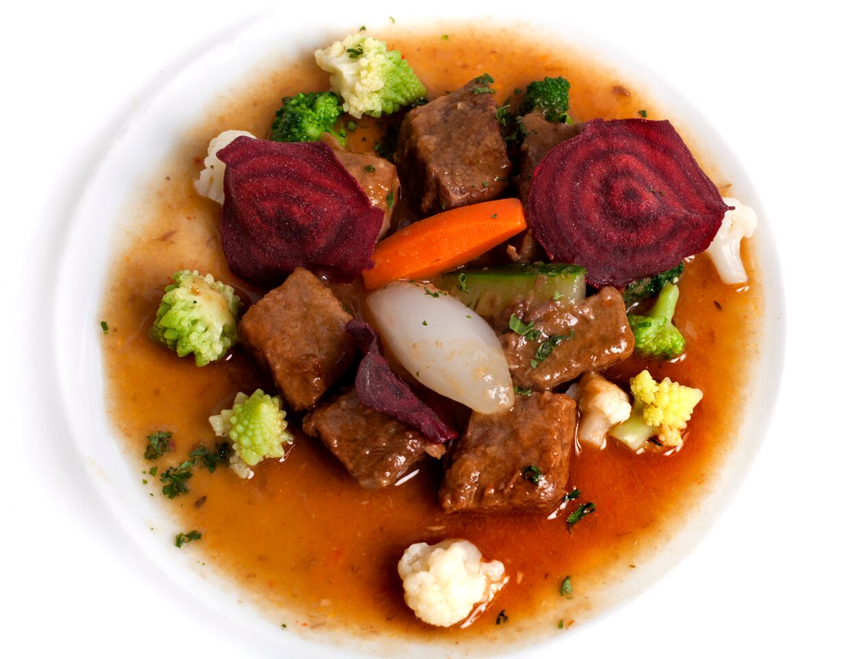 - Jardinera de ternera de la Sierra de Guadarrama, vegetales torneados y chips.