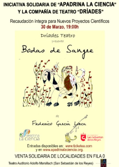 Y qué mejor forma de apoyar la ciencia y ser solidario, que disfrutar de una tarde con García Lorca y su obra cumbre, de la mano de Dríades. Las entradas para el evento están disponibles en la web de localidades www.ticketea.com , en la propia web de la asociación www.apadrinalaciencia.org o en el teatro, media hora antes del comienzo de la función. No obstante, todos aquellos que quieran colaborar apoyando el proyecto y no puedan asistir; podrán adquirir localidades de la Fila 0 a través de los mismos canales de venta o directamente en la página de Apadrina la Ciencia.
