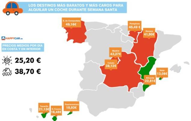 Las ciudades de costa e islas van a ser, de media, un 34,89% más baratas que las de interior durante Semana Santa, por lo menos en lo que respecta a los precios de coches de alquiler. Según ha dado a conocer el comparador .happycar.es. reservar un vehículo en los destinos de interior costará una media de 38,70 € por jornada, doce euros más que en las ciudades de costa e islas, donde los precios serán más competitivos y se situarán en una media de 25,20 €.