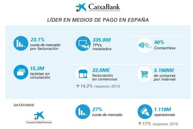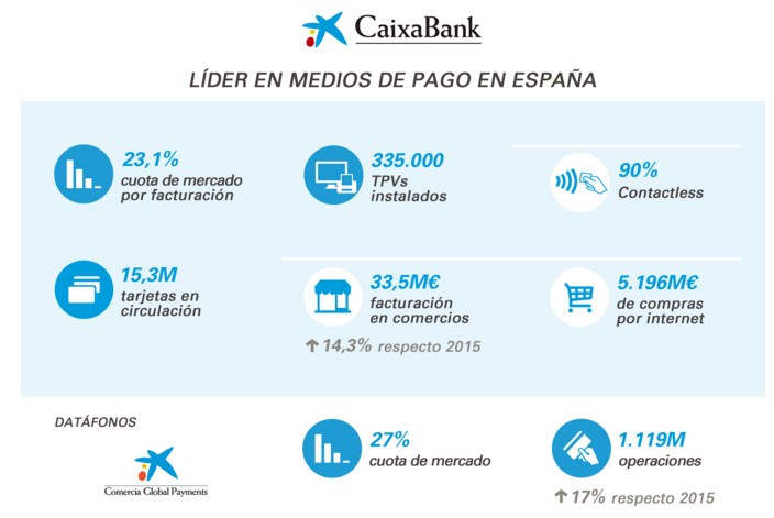 En el caso de CaixaBank, la entidad financiera es líder en medios de pago en España, con 15,3 millones de tarjetas en circulación, una cuota de mercado por facturación del 23,1% y más de 335.000 TPV instalados, de los que el 90% son contactless. En 2016, las tarjetas de CaixaBank facturaron 33.457 millones de euros en comercios (un 14,3% por encima de 2015) y 5.196 millones de euros en compras por Internet.