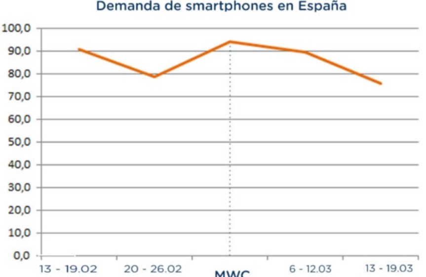 Sin embargo, este pico de interés fue algo temporal, ya que el número de búsquedas de móviles descendió de forma considerable dos semanas más tarde del Mobile World Congress, en un 19,23% en España y en un 19,95% en Europa.