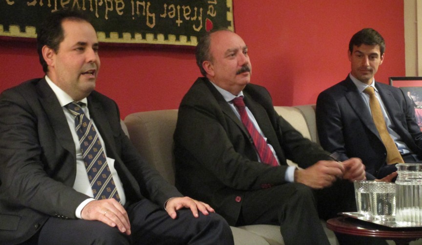 Carlos Uriarte, a la izquierda, peesenta a José Luis Barceló, en el centro de la fotografía, durante su intervención en el Colegio Mayor Montalbán.
