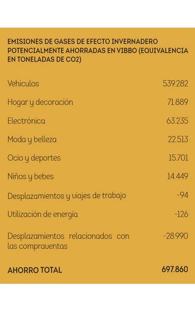 Pese a ello, la compraventa de vehículos de segunda mano sigue siendo la que más CO2 ahorró en 2016 a través de la app y web de vibbo, con 539.282 toneladas de dióxido de carbono. Le siguen a mucha distancia las categorías de hogar y electrónica, con 71.889 y 63.235 emisiones potencialmente ahorradas, respectivamente. Se trata de dos categorías de objetos que requieren mucha cantidad de energía o agua para la extracción de algunos de sus materiales, como el aluminio y el oro de algunos componentes electrónicos de los smartphones o el textil que contiene un sofá.