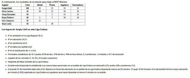 El jugador del Real Madrid ha obtenido 100 puntos sobre 100 posibles, sumando el voto máximo de los cuatro colectivos implicados en la elección del MVP Movistar. Es solo la segunda vez desde que la Liga Endesa utiliza este método de votación para elegir al mejor de la fase regular (temporada 2006-07) que un jugador obtiene este galardón de forma unánime. El primero fue Luis Scola, precisamente en la citada campaña 2006-07.