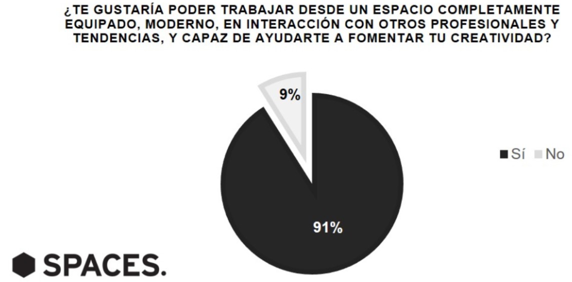 El modelo de espacio de trabajo tradicional cada vez está más obsoleto, ya que los profesionales de hoy en día buscan espacios modernos capaces de inspirarles. Según un estudio de Spaces, la nueva oferta internacional de espacios de trabajo que promueve una comunidad dinámica para emprendedores y empresas, a 9 de cada 10 españoles les gustaría trabajar en un espacio completamente equipado, moderno y en interacción con otros profesionales y tendencias. De hecho, para casi la mitad de los encuestados (48,4%), este tipo de espacios supondría un impulso para ser más creativo y productivo.