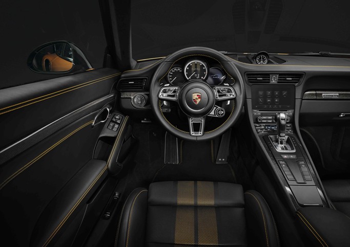 El habitáculo es único y elegante. Los asientos deportivos regulables en 18 posiciones están cubiertos de dos capas de cuero perforado. La capa interior tiene dos tiras en Amarillo Oro que garantizan un efecto único. Las costuras y el bordado de las letras Turbo S sobre los reposacabezas también es de Amarillo Oro de contraste, y el techo está forrado de Alcántara con una doble tira de Amarillo Oro. Un fino hilo de cobre va integrado en las molduras del paquete de carbono interior. La placa que lleva el número de esta edición limitada en el lado del pasajero subraya la exclusividad del coche. Los umbrales de las puertas, también acabados en carbono, van iluminados con las letras Exclusive Series.