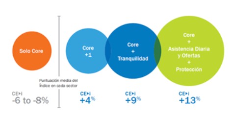 Los resultados demuestran que existe una relación directa entre el número de productos o servicios que un cliente compra o contrata con una compañía y la puntuación del Customer Engagement Index. Esto corrobora que cuántos más productos o servicios se adquieren, más engagement se obtiene. “Los productos y servicios adicionales, como los relacionados con viajes y tiempo libre o protección, ofrecen un valor añadido real a los consumidores. Según el informe de Affinion, estos consumidores representan las puntuaciones más altas en todos los sectores” (banca, retail y telcos)”