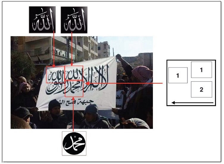 Al material abajo expuesto se le proyectan tres líneas del localizador de la “SHAHADA” (A,B,C) en un intento de encajar los componentes de la manifestación Gráfico-Escrita con las referencias numeradas del localizador, comprobando así la concordancia Gráfico-Escrita. El material gráfico del ejemplo 2 tiene concordancia con la línea 2. Eso nos lleva a la conclusión de que nuestro material lleva una composición Gráfico-Doctrinal, en este caso la “SHAHADA” y, por consiguiente, nos encontramos ante un material con indicios de islamismo y tendencia Yihadista.