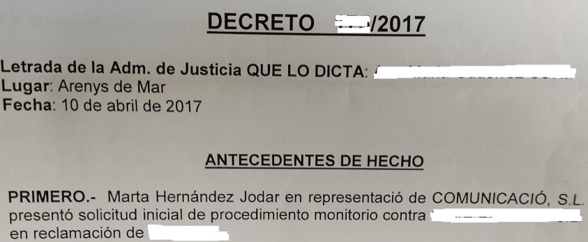 2.- “¿Y?”, me dijo la mujer que me atendía. A lo que le mostré el documento “DECRETO” de los Juzgados de Arenys en el que se me identificaba con nombre y apellidos como representante de mi empresa, con identificación social y NIF, más el documento recibido desde el JUZGADO DE PAZ.