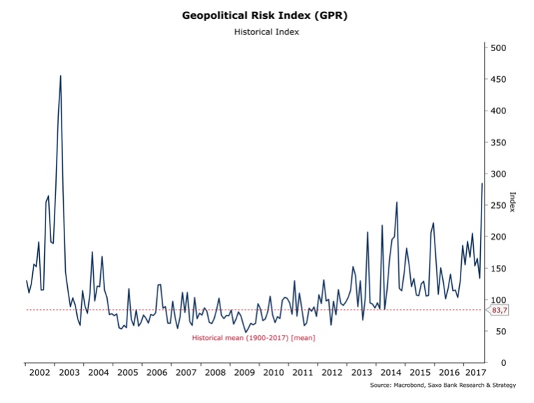 (Por el Equipo de análisis de Saxo Bank).- Debido a las tensiones en la península coreana, el Índice de Riesgo Geopolítico (GPR) está en su nivel más alto desde la invasión de Irak en 2003. La prueba de una bomba de hidrógeno por parte de Corea del Norte este fin de semana ha llevado a una nueva escalada del miedo, animando a que los inversores a aumentar sus posiciones en activos refugio. El Índice de Riesgo Geopolítico (GPR) se sitúa en torno a los 290 puntos, lo que represente el nivel más alto desde la invasión de Irak en 2003. Este índice, elaborado por Dario Caldara y Matteo Lacoviello, es un indicador tomado en cuenta por la Junta de Gobernadores de la Reserva Federal.
