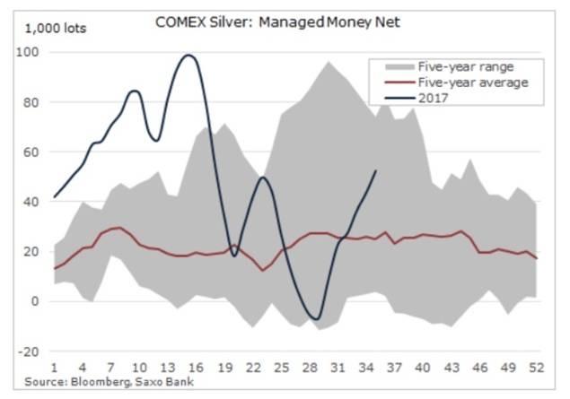 Como resultado, las posiciones netas largas están un 47% por debajo del récord de abril, mientras que el oro sólo tendría que aumentarlas un 20% para batir su récord de junio de 2016.