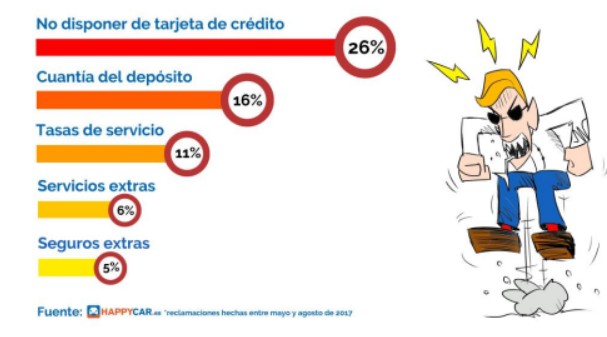 La primera razón que más quejas ha generado está relacionada con las modalidades de pago que admiten las empresas de alquiler. El 26% de las reclamaciones se deben a la imposibilidad de adquirir un vehículo con una tarjeta de débito o de prepago. Y es que, hay que tener en cuenta, que las firmas de ‘rent a car’ solicitan la disposición de una tarjeta de crédito expedida al nombre del conductor principal para formalizar el contrato en la oficina de recogida. Así, pueden proceder al bloqueo de un depósito, con el que se haría frente a los gastos de reparación en caso de daños o robo y que se devuelve íntegramente cuando termina el periodo de alquiler.