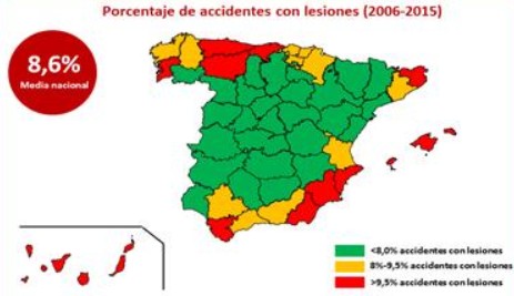 La Fundación Línea Directa también ha realizado un mapa de la lesividad vial en el que compara el porcentaje nacional de accidentes con lesionados con el de cada provincia, con resultados muy interesantes. Para ello, se ha enfrentado el número total de accidentes de tráfico con el número de siniestros con daños corporales, abiertos por la aseguradora Línea Directa entre 2006 y 2015.