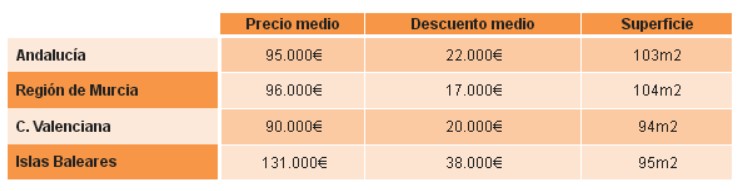 De este modo, las grandes oportunidades se pueden encontrar en Andalucía donde hay cerca de 400 viviendas rebajadas una media del 18%, o en los 350 inmuebles de la Región de Murcia, por 96.000 euros y 104 metros cuadrados, de promedio. En la Comunidad Valencia se han seleccionado 250 inmuebles a un precio medio de 90.000€ y en las Islas Baleares las viviendas poseen una rebaja de 38.000 euros de promedio. La campaña estará disponible hasta el 31 de diciembre.