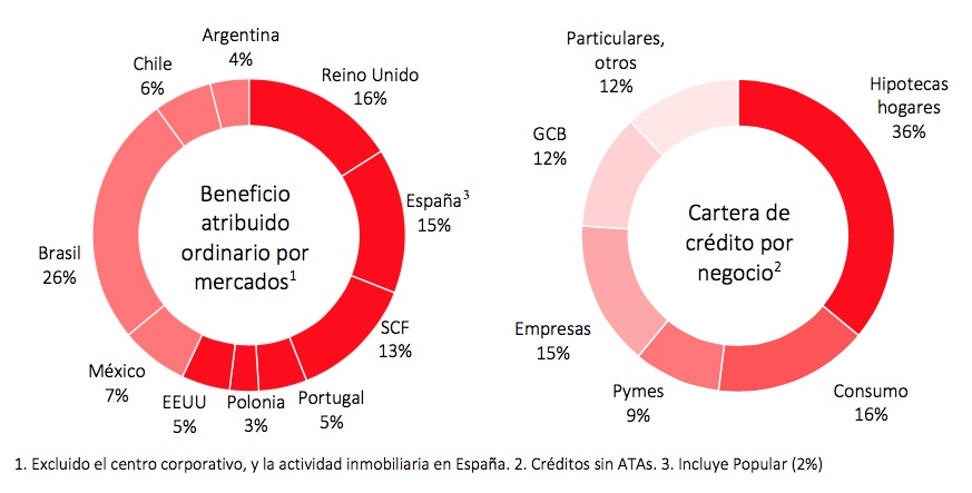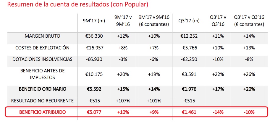 En el tercer trimestre, el Grupo se apuntó unos cargos no recurrentes de 300 millones de euros por la integración del Popular (anunciados en el momento de la adquisición), de 85 millones de euros, principalmente por la integración de la unidad minorista y de la banca de consumo en Alemania, y de 130 millones de euros por empresas participadas, activos intangibles y otros conceptos. Sin estas partidas extraordinarias, el beneficio ordinario fue de 5.592 millones de euros, un 14% más en euros constantes (es decir, excluyendo el impacto de los tipos de cambio).