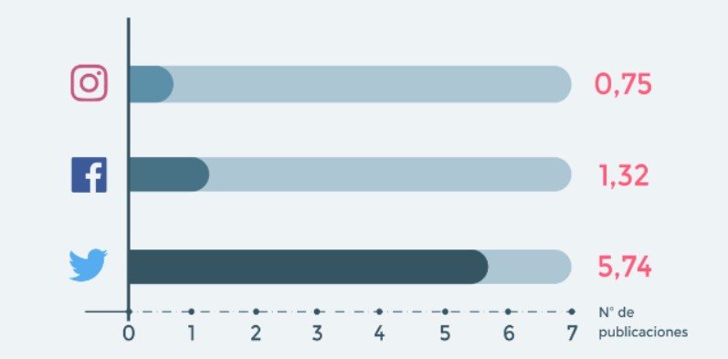¿Cuál es la red en la que se publica más a menudo? Según datos del estudio de Metricool, a la cabeza está Twitter con una media de 173 publicaciones mensuales por cuenta, es decir, 5,74 tweets al día. Además, el análisis desvela que, conforme la cuenta gana más seguidores, aumenta la frecuencia de publicación. Facebook ocuparía el segundo puesto, en cuanto al número de publicaciones con 39,58 publicaciones mensuales (1,32 publicaciones diarias). Al igual que en Twitter, la cantidad de publicaciones varía en función del tamaño de la comunidad. Por su parte, Instagram es la red donde menos se publica (21,03 publicaciones mensuales, 0,75 publicaciones diarias).
