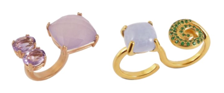 Los modelos elegidos por la actriz son por un lado el anillo Harmony en vermeil de oro rosa con calcedonia rosa (precio 400 €), y por otro el anillo Snake de vermeil en oro amarillo con calcedonia y tsavoritas(precio 515 €).
