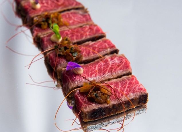 Y es que De Labra puede presumir de deleitar a los comensales con platos elaborados con este tipo de res, Tajima 100% full blood (pura sangre), muy difícil de encontrar fuera de Japón. Un producto de altísima calidad y múltiples propiedades -la mejor carne del mundo para algunos expertos-, que protagoniza las suculentas propuestas presentadas por el chef Miguel Álvarez: