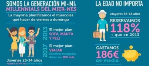 Los jóvenes de 25 a 34 años son un público muy importante para el sector de las escapadas y las experiencias. De hecho, viajan un 50% más que hace cinco años. Si en 2013 su mejor plan era: sofá, manta y peli; en la actualidad prefieren viajar a quedarse en casa y, además, sus escapadas duran un 10% más. No obstante, la edad no importa en esto del fin de semana. De hecho, los mayores de 55 y 64 años reservan un 118% más que hace cinco años y son el grupo que más dinero gasta, en concreto, una media de 186 euros.