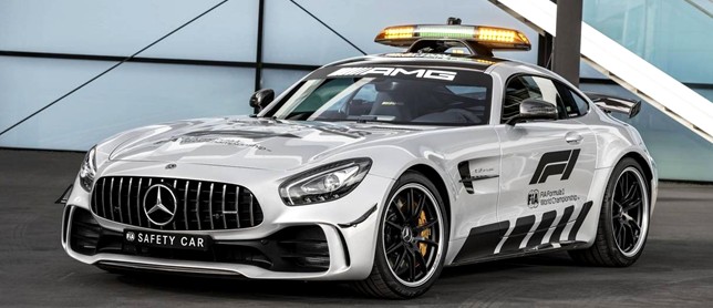 El Mercedes-AMG GT R tiene el circuito en sus genes, por lo que solo han sido necesarias un pequeño número de modificaciones para transformarlo en el Safety Car Oficial para el Campeonato del Mundo de la Formula 1® de la FIA. El Paquete AMG Track con jaula de seguridad y sistema de frenos de alto rendimiento cerámicos se equipan como opcionales. En cuanto a su diseño exterior, el Mercedes-AMG GT R Safety Car se diferencia del vehículo de producción por los vinilos de la FIA F1 y el puente de luces. Este último es de fibra de carbono y está diseñado para ofrecer la menor resistencia posible a la vez que deriva un flujo aerodinámico optimizado hacia el alerón trasero del vehículo. El diseño y la posición del puente de luces son el resultado de un intenso trabajo en el túnel de viento.