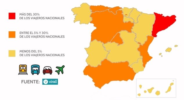 menor número los canarios (0,40%), los baleares (0,47%) y los castellanomanchegos (0.94%). Las comunidades de costa le ganan la partida de visitantes a los de interior El 86,84% de los viajeros nacionales se desplazarán por España durante el puente. Por comunidades autónomas, los destinos de costa atraerán la atención de los turistas por delante de las ciudades y comunidades de interior. Centrándonos en los datos, Cataluña se colocará como líder nacional, atrayendo durante los próximos días al 34,91% de los viajeros. Tras Cataluña se sitúan Andalucía, destino al que se dirigirán el 13,87% de los usuarios de transporte público, y la Comunidad Valenciana, la cual absorberá el 6,92% del flujo de viajeros.