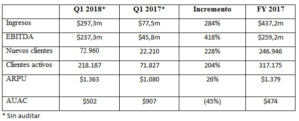 El aumento en los ingresos proviene del crecimiento significativo de Clientes Nuevos y Activos. Como se indicó en los resultados preliminares de la compañía emitidos en febrero de 2018, hubo un crecimiento significativo de clientes en el cuarto trimestre de 2017 que ha continuado en el primer trimestre de este año. El ARPU ha continuado beneficiándose de las mismas tendencias que hicieron aumentar la actividad comercial en 2017.* Sin auditar
