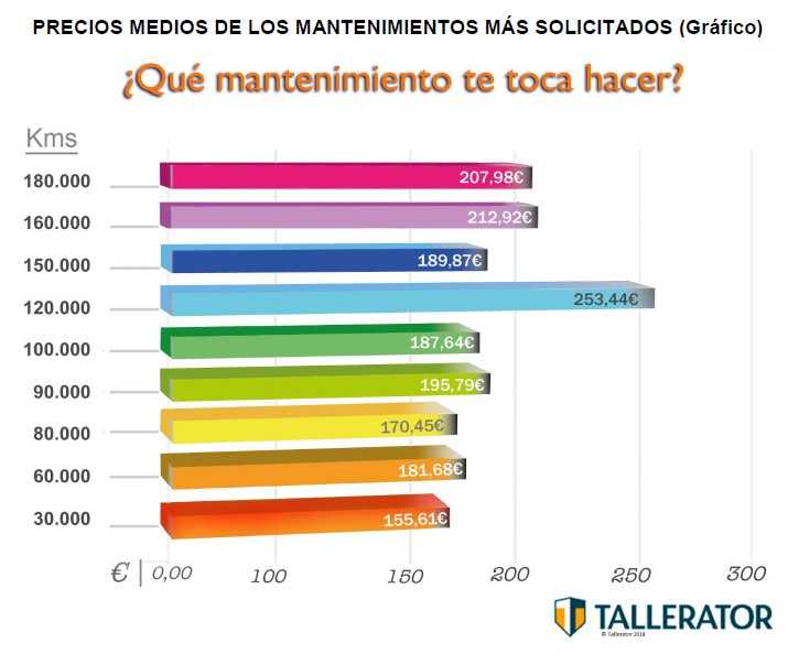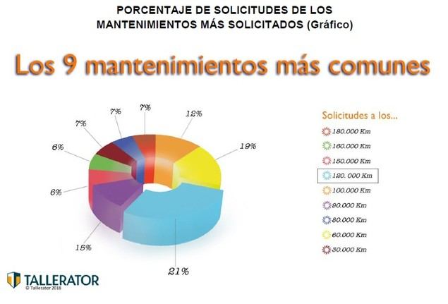 Esta revisión tiene un precio medio de 253,44 euros en España, y representa el 21 % de las solicitudes de mantenimiento. Le sigue de cerca la revisión a los 60.000 km, con un 19 % de las peticiones, y un coste medio de 181,68 €. Si hacemos unos pocos kilómetros más, llegaremos a dos etapas también muy solicitadas: a los 90.000 y a los 100.000 kms. Sus tarifas medias se sitúan con precios medios de 195,79 € y 187,64 € respectivamente. El análisis de Tallerator marca que a los 30.000 kms, la cifra de solicitudes para pasar por el taller se incrementa significativamente.
