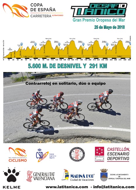 Sobre ruedas. El Sábado 26 se disputará el Desafío Titánico G.P. Oropesa del Mar, prueba contrarreloj de la naciente Copa de España de Carretera Ultrafondo de la Real Federación Española de Ciclismo, nueva disciplina que consta de tres pruebas. Una carrera en la compiten juntos hombres, mujeres y equipos mixtos de todas las edades en las modalidades de solitario, dúo y equipos de 4 a 8 integrantes que a la vez se divide en masculino, femenino y mixto para los ciclistas Élite, Sub23 y máster 30 – 40 – 50 y 60. Siendo la única disciplina en ciclismo en la que se pueden competir en dúos o equipos mixtos, y lo harán en una ruta de 291 o 261 km según la categoría con 5.600 metros de desnivel positivo.