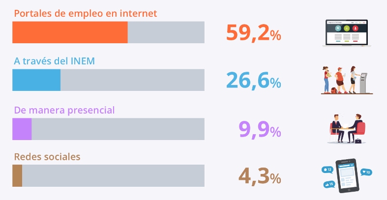 El análisis realizado por el comparador de seguros también desvela que el 60% de los españoles busca activamente empleo; y que prefiere los portales específicos online para hacerlo. Unos canales que les permiten acceder y comparar entre diferentes ofertas de empleo. Solo un 4,5% va más allá y emplea las redes sociales; y el resto opta por métodos más tradicionales: el 26,5% busca trabajo por el INEM y el 9% acude a tirar el currículum de forma presencial.