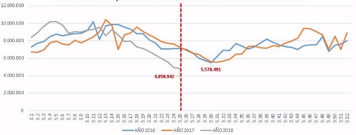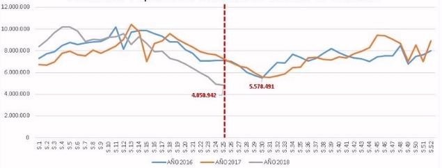 En comparativa con el año pasado, sólo en la semana 25 del mes de junio se ha reducido la producción en más de 3 millones de kilogramos, lo que supone una disminución del 38,9% con respecto a este mismo periodo de 2017. Además, se trata del dato más bajo de los últimos 10 años para este mismo periodo con 4.850.942 millones de kilogramos producidos.