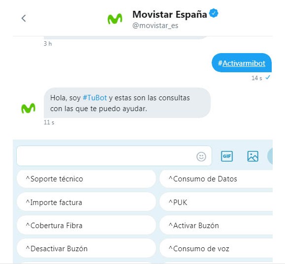 Algunas de las gestiones que se pueden realizar con el bot de Movistar en Twitter son consultar el consumo de datos o de voz, conocer el importe de la factura, obtener el puk de la tarjeta SIM o comunicar y hacer seguimiento de una incidencia técnica.