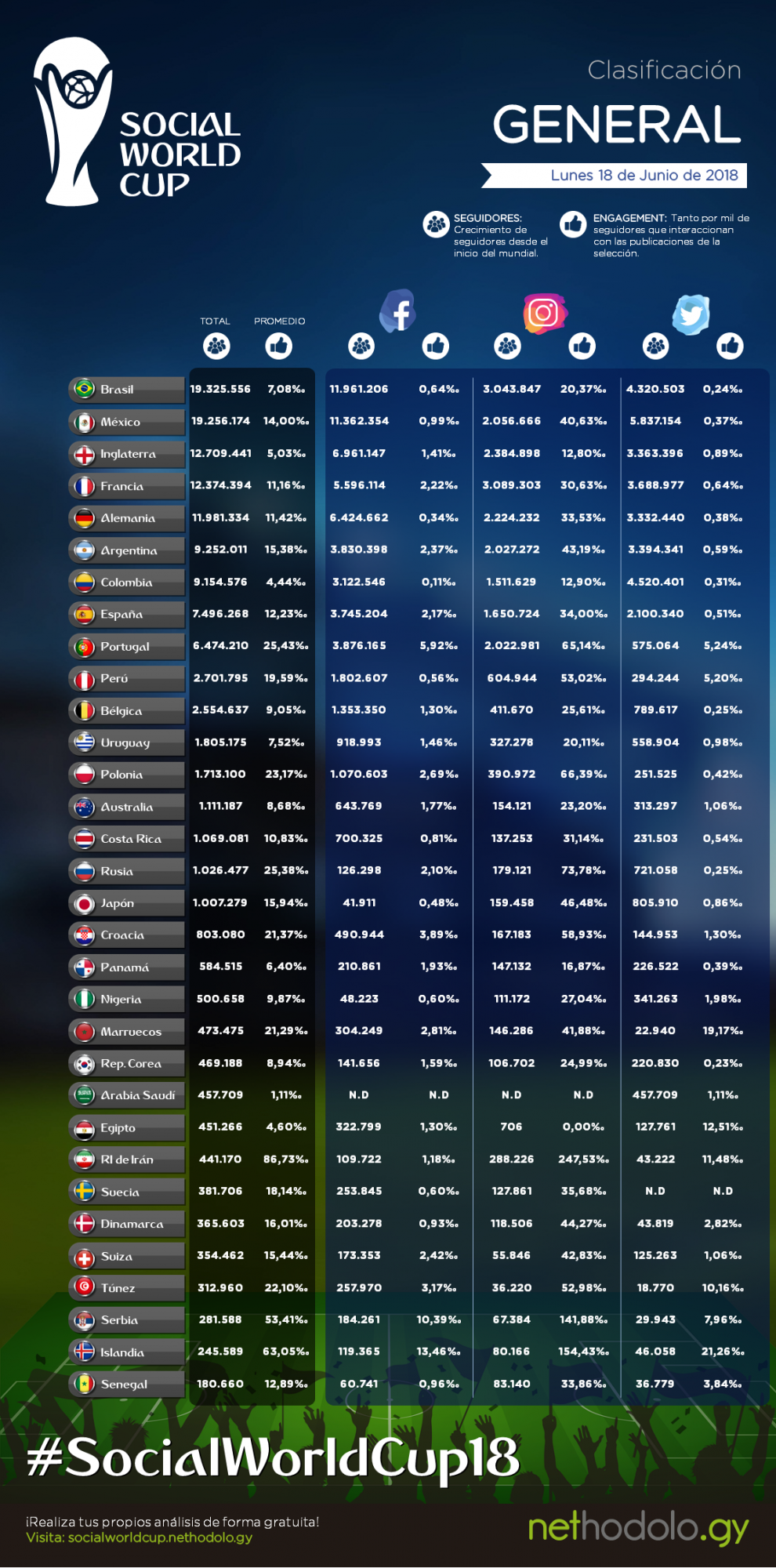 Cada día se recogerá la evolución del número de seguidores y las interacciones que los combinados nacionales consiguen a través de sus perfiles oficiales en Facebook, Instagram y Twitter. Cada mañana se publicará una clasificación general en la que se podrá seguir la audiencia total conseguida (la suma de las tres redes sociales) y el promedio de engagement. Esta última métrica tiene en cuenta el número de interacciones (“me gusta”, compartidos, comentarios, etc.) que tienen las publicaciones de la selección, dividido entre el número total de seguidores en la red social correspondiente.