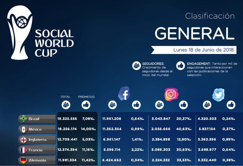 Al arrancar el Mundial el pasado jueves, las selecciones partían de una base de seguidores totales de 125 millones. Tras los primero encuentros, esta cifra ha crecido en dos millones. Las cinco primeras posiciones del ranking son copadas por dos selecciones de Latinoamérica: Brasil y México. Los otros tres puestos corresponden a los clásicos del Mundial: Inglaterra, Francia y Alemania.